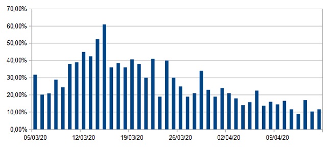 Il grafico sull’andamento dei contagi giornalieri nelle Marche nel periodo 4 marzo – 15 aprile 2020.