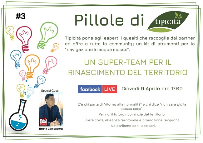 MARCHE – Giovedì 9 Aprile pomeriggio alle ore 17.00 è in programma la terza Pillola di Tipicità, in diretta sulla pagina Facebook. Si tratta di un’azione innovativa “del fare” a livello nazionale , in periodo di Corona Virus, in quanto i temi economici e territoriali sviluppati nel tradizionale Festival vengono trattati on-line, ma con la partecipazione attiva di un’ampia comunità. Infatti sono oltre 2.500 le persone che hanno visualizzato e molte delle quali anche interagito, in occasione della seconda Pillola, una platea degna di un evento vero e proprio!