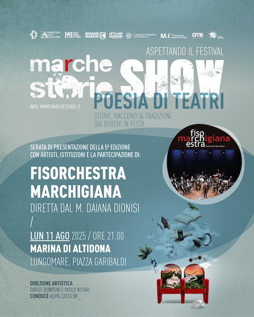 “Marchestorie è un viaggio immersivo che ci porta a riscoprire l’anima delle Marche, una terra intrisa di storia e poesia. – Ha spiegato il direttore artistico Paolo Notari – Nelle belle serate di “Marchestorie Show” vogliamo presentare in anteprima i temi che andremo a sviluppare a settembre con eventi speciali di avvicinamento dove raccontiamo con la musica e la poesia le bellezze e le peculiarità della Regione e ad Altidona grazie alla Fisorchestra Marchigiana ripercorreremo l’incredibile storia della fisarmonica, nata come strumento popolare, tutta made in Marche nell’ 800, che ha poi conosciuto un’evoluzione straordinaria, diventando un’eccellenza mondiale, protagonista di numerosi generi musicali internazionali”.