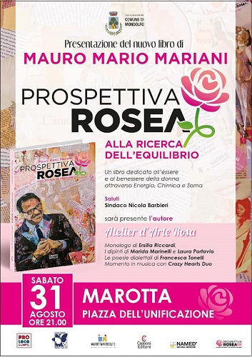MONDOLFO (PU) – Sabato 31 agosto alle 21, piazza dell’Unificazione ospita la presentazione spettacolo del libro Prospettiva Rosea (Capponi Editore) del Dottor Mauro Mario Mariani. L’iniziativa, patrocinata dal Comune di Mondolfo, con la presenza del Sindaco Nicola Barbieri, è organizzata dalla Pro Loco di Marotta con il Circolo Culturale.