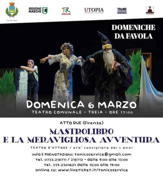 TREIA – Domenica 6 marzo 2022, quarto ed ultimo appuntamento con la stagione DOMENICHE DA FAVOLA, progetto che il Comune di Treia dedica ai più piccoli e alle loro famiglie, come momento di avvicinamento e conoscenza alla cultura teatrale.Al Teatro Comunale, alle ore 17.00, andrà in scena “Mastrolibro e la Meravigliosa Avventura”.