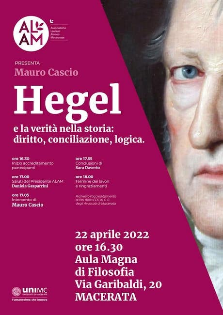 MACERATA – L’Associazione Laureati Ateneo Maceratese organizza per venerdì 22 aprile un incontro con il giornalista e scrittore Mauro Cascio su “Hegel e le verità nella storia: diritto, conciliazione, logica”. L’appuntamento, aperto a tutti gli interessati, è per le 16.30 nell’aula magna di filosofia in via Garibaldi 20. E’ stato richiesto l’accreditamento ai fini della formazione al Consiglio dell’ordine degli avvocati di Macerata. L’incontro sarà introdotto dalla presidente dell’Alam Daniela Gasparrini e concluso con una riflessione a cura di Sara Daverio.