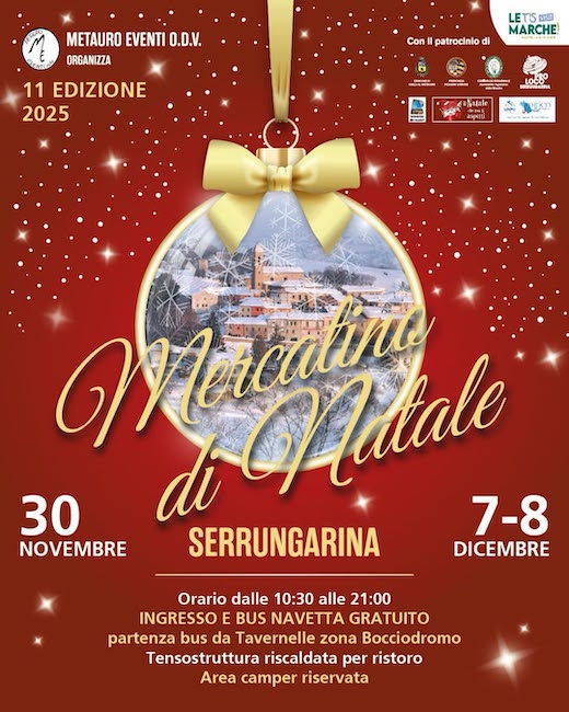 COLLI AL METAURO (PU) – L’Associazione Metauro Eventi ODV organizza l’11esima edizione del Mercatino di Natale di Serrungarina, in programma il 30 novembre, 7 e 8 dicembre, nel suggestivo borgo del Comune di Colli al Metauro.
