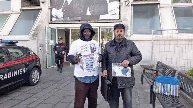 PESARO – Protesta silenziosa davanti al tribunale di Pesaro da parte di Francesco Miccoli, 64 anni di Taranto, ex artigiano, con distribuzione di volantini, aiutato da un giovane senegalese. Miccoli è il padre di Lorenzo, militare morto a 20 anni a Pesaro il 2 marzo del 1995 per leucemia acuta nel reparto di Ematologia dell’ospedale pesarese diretto allora dal prof. Guido Lucarelli.