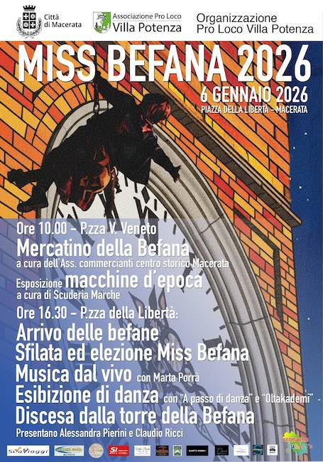 MACERATA – Il prossimo 6 gennaio torna in piazza della Libertà la tradizionale manifestazione “Miss Befana” giunta quest’anno alla XVIII edizione mentre nell’area pedonale di piazza Vittorio Veneto avrà luogo un mercato espositivo e, nell’area adibita a parcheggio, di auto d’epoca.