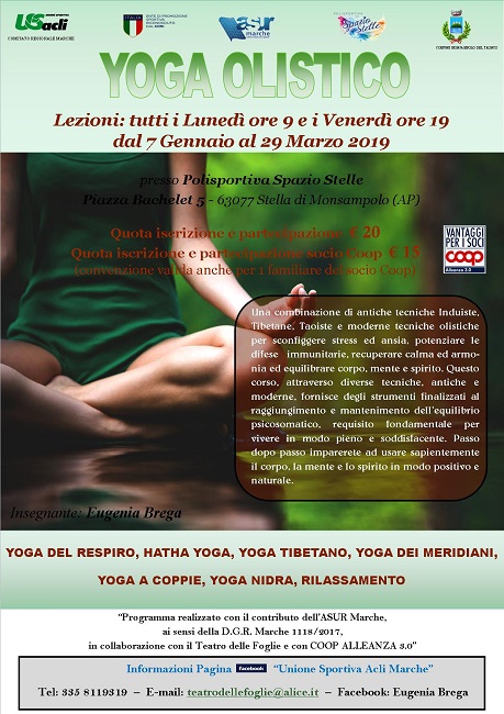MONSAMPOLO DEL TRONTO – Prenderà il via il 7 Gennaio il corso di yoga olistico presso il la Polisportiva Spazio Stelle in Piazza Bachelet 5 nella frazione Stella. L’iniziativa è organizzata nell’ambito del progetto regionale “Sport senza età” dall’Unione Sportiva Acli Marche grazie al contributo dell’Asur Marche (ai sensi della deliberazione di Giunta regionale 1118/2017), col patrocinio dell’amministrazione comunale di Monsampolo del Tronto e la collaborazione di Coop Alleanza 3.0 e Teatro delle foglie.