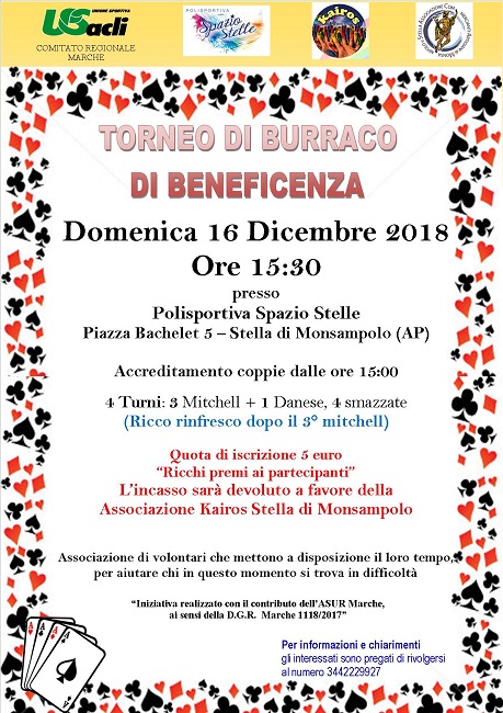 Domenica 16 dicembre, a partire dalle ore 15.30, presso la sede della Polisportiva Spazio Stelle in Piazza Bachelet 5, infatti, avrà luogo un torneo di burraco di beneficenza a favore dell’Associazione Kairos, associazione di volontari che mettono a disposizione il loro tempo per aiutare chi in questo momento si trova in difficoltà.