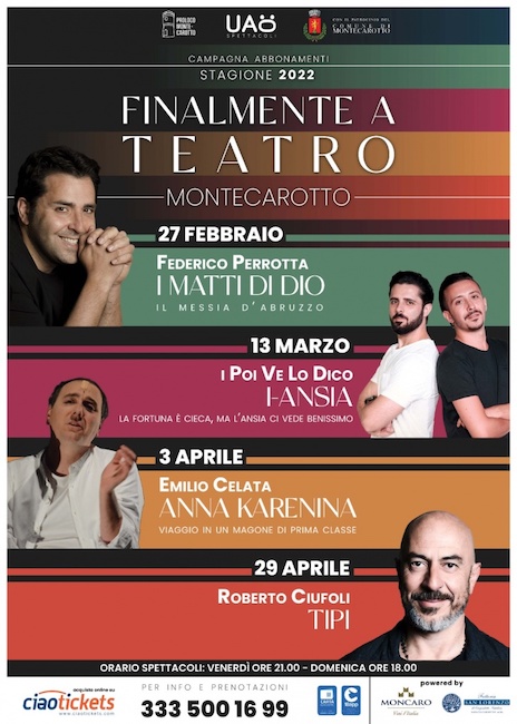 MONTECAROTTO (AN) – A Montecarotto domenica, 27 febbraio, prenderà il via “Finalmente a Teatro”, la stagione teatrale 2022 che dà il via alla campagna abbonamenti; la rassegna è curata dalla Uao Spettacoli, grazie alla preziosa collaborazione della ProLoco, con il Patrocinio del Comune di Montecarotto.