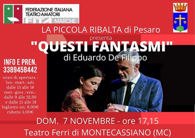 MONTECASSIANO (MC) – Domenica 7 novembre 2021, ore 17.15 al Teatro Ferri di Montecassiano secondo appuntamento del Festival di teatro amatoriale Marche in Atti organizzato dalla FITA Marche. La Compagnia Piccola Ribalta di Pesaro metterà in scena lo spettacolo “Questi Fantasmi”di Eduardo De Filippo, una commedia che ha saputo raccogliere negli anni un eccezionale successo di pubblico.