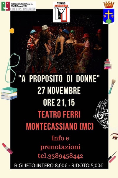 MONTECASSIANO (MC) – Sabato 27 novembre 2021, alle ore 21.15 al Teatro Ferri di Montecassiano, il Teatro Accademia di Pesaro presenta: “A proposito di donne” per la regia di Vincenzo Giampaoli.