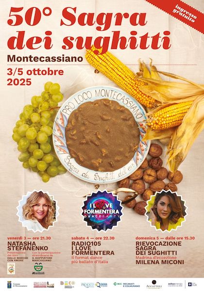 La 50esima Sagra dei sughitti è sede ufficiale di tappa del Grand Tour delle Marche 2025 programmata a Montecassiano .Sabato 4 ottobre, SugHIT parade, degustazione guidata