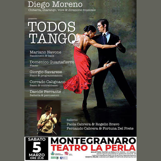 MONTEGRANARO (FM) – Sabato, 5 Marzo 2022 alle ore 21.15, nell’ambito della stagione del Teatro La Perla di Montegranaro, andrà in scena lo spettacolo “Todos Tango” con la direzione musicale Diego Moreno.