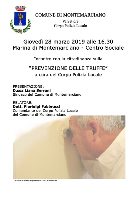 MONTEMARCIANO (AN) – Giovedì 28 marzo 2019, alle ore 16.30 presso il Centro Sociale di Marina di Montemarciano si terrà un incontro con la cittadinanza sul tema: “Prevenzione delle truffe”, a cura della Polizia Locale.
