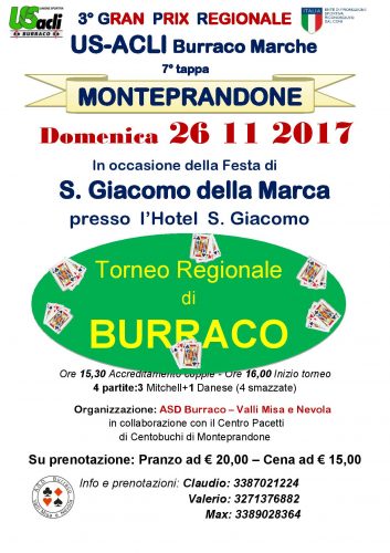 MONTEPRANDONE – Sono aperte le iscrizioni alla settima tappa della terza edizione del Gran prix regionale di burraco dell’U.S. Acli.La manifestazione si giocherà domenica 26 novembre a partire dalle ore 16 presso l’Hotel San Giacomo ed è organizzata in collaborazione con Asd valli Misa e Nevola e con il Centro Pacetti.