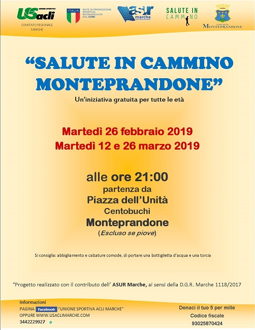 MONTEPRANDONE – Dopo la pausa natalizia, di fine ed inizio anno, martedì 26 febbraio riprenderà il progetto “Salute in cammino” con appuntamento a Centobuchi in piazza dell’Unità alle 21.