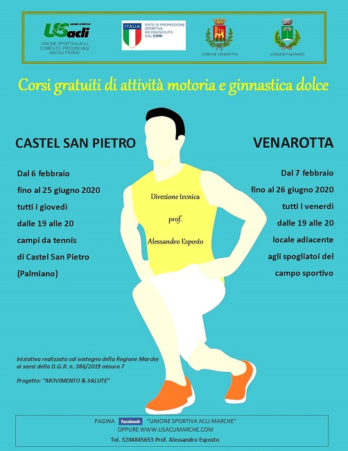VENAROTTA (AP) – Dal 6 febbraio al 26 giugno si svolgeranno a Palmiano e Venarotta due corsi gratuiti di attività motoria e ginnastica dolce diretti dal professor Alessandro Esposto.