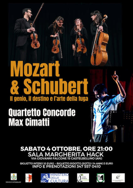 CASTELBELLINO (AN) – Nella sala Margherita Hack di Castelbellino va in scena oggi, sabato 4 ottobre, alle ore 21.00, un concerto che vede fondersi le musiche del Quartetto Concorde – giovane quartetto di musicisti marchigiani – e le parole dello scrittore e narratore Max Cimatti per legare insieme i due grandi della musica, Mozart e Schubert.