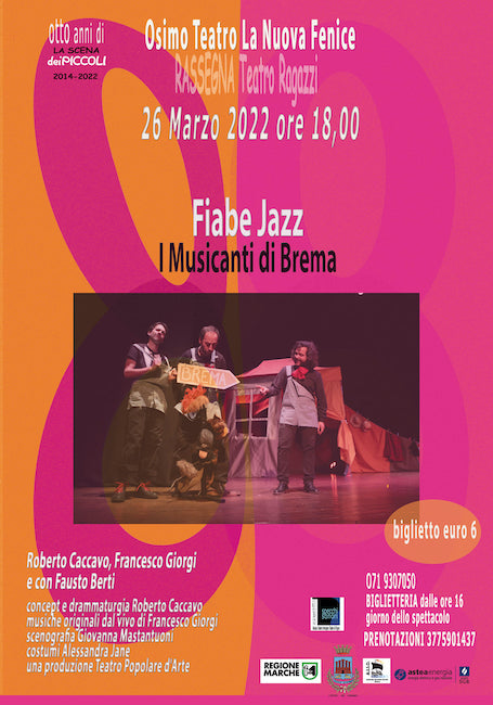 OSIMO (AN) – Sabato 26 marzo 2022, alle ore 18.00, al Teatro La Nuova Fenice di Osimo andrà in scena Fiabe Jazz – I Musicanti di Brema, spettacolo per bambine/i e ragazze/i ideato prodotto dal Teatro Popolare d’Arte.