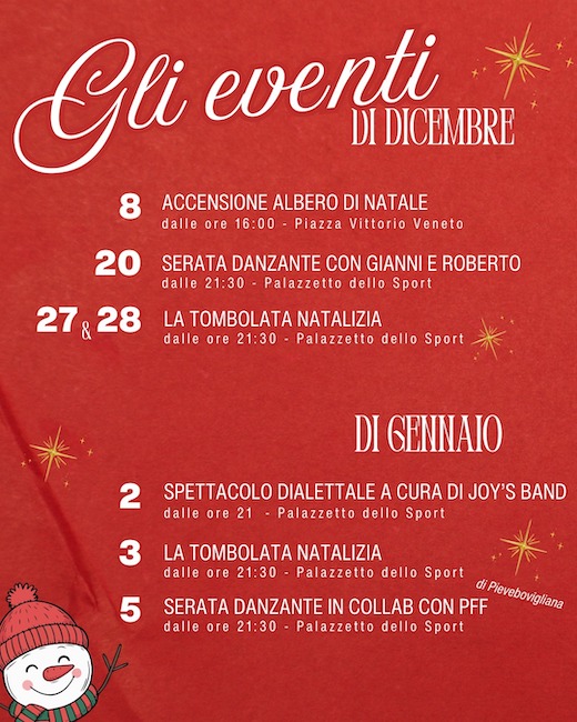 Il nuovo anno, il 2026, inizierà poi alla grande: il 2 gennaio spettacolo dialettale a cura di Joy’s Band, a partire dalle ore 21 al Palazzetto dello Sport. Il 3 gennaio ancora “Tombolata Natalizia”, dalle ore 21,30 al Palazzetto dello Sport di Pievebovigliana.