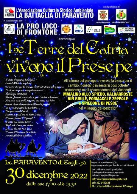 A Paravento di Cagli, un teatro a cielo aperto per raccontare le scene della Natività con ‘Le Terre del Catria vivono il presepe’: una delle più emozionanti rappresentazioni sacre in Italia sulla nascita di Gesù con 130 figuranti e 30 scene di vita rurale, di vecchi mestieri, di focolari familiari. Un grande salto indietro nel tempo, per scorprire come si viveva a Betlemme, con la banca dove fare il cambio in sesterzi da usare negli accampamenti per acquistare nei mercati. Ci saranno il bue e l’asino, le pecorelle con gli agnellini e le caprette, i Re Magi con i doni che seguono la stella, le cornamuse e gli angeli. Data unica il 30 dicembre.