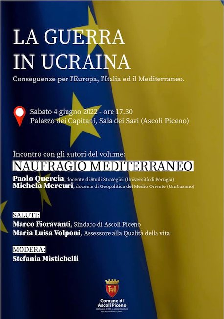 ASCOLI PICENO – Un incontro per parlare della guerra in Ucraina e conoscere a fondo le conseguenze del conflitto per l’Europa, l’Italia e per tutta l’area del Mediterraneo. Sabato 4 giugno alle ore 17.30, alla sala dei Savi del Palazzo dei Capitani, sarà presentato il volume “Naufragio Mediterraneo”, alla presenza degli autori Paolo Quercia (docente di Studi strategici dell’Università di Perugia) e Michela Mercuri (docente di Geopolitica del Medio Oriente di Unicusano). Il pomeriggio sarà aperto dai saluti istituzionali del sindaco Marco Fioravanti e dell’assessore alla Qualità della vita, Maria Luisa Volponi, mentre a moderare l’incontro sarà Stefania Mistichelli.