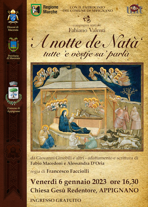 APPIGNANO – Appignano festeggia l’Epifania con lo spettacolo “A notte de Natà” della Compagnia Valenti di Treia, venerdì 6 gennaio alle ore 16,30 nella Chiesa di Gesù Redentore ad ingresso libero.