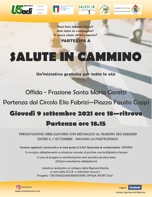 Si tratta di una camminata sportiva, organizzato nell’ambito delle attività del progetto “Destinazione benessere Offida sport 2021”, promosso dall’assessorato allo sport del Comune di Offida, coordinato dall’Unione Sportiva Acli Marche, realizzato in collaborazione con il Circolo Elio Fabrizi e cofinanziato dalla Regione Marche.