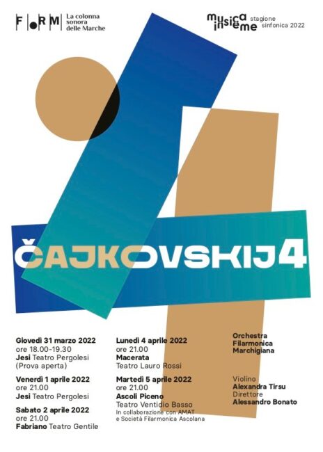 Quattro concerti, con la violinista Alexandra Tirsu, diretti da Alessandro Bonato, in programma il Concerto per violino e la Quarta Sinfonia. Prova aperta il 31 marzo a Jesi; concerti dal primo aprile a Jesi, Fabriano, Macerata e Ascoli Piceno