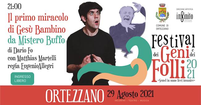 ORTEZZANO (FM) – Oggi, domenica, 29 agosto 2021, alle ore 21.00, in Piazza Umberto I a Ortezzano, andrà in scena “Il primo miracolo di Gesù Bambino” con Matthias Martelli per la Regia di Eugenio Allegri.