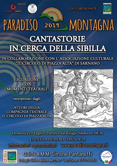 BOLOGNOLA (MC) – Un’estate ricca di escursioni e trekking ma non solo. L’associazione “ParadisoMontagna” continua il suo progetto culturale con l’intento di arricchire le attività proposte in montagna integrandole con l’arte e la musica proponendo due eventi molto interessanti. Il primo, dal titolo “Cantastorie in cerca della Sibilla” è legato al mondo del teatro e avrà luogo domenica 21 luglio 2019 con partenza dal Rifugio Sibilla. Vedrà protagonisti gli attori del “Circolo di Piazza Alta” di Sarnano che hanno immaginato di far incontrare durante l’escursione Guerrino cavaliere incorruttibile, eroico protagonista di avventure straordinarie e Antoine intellettuale e autore satirico e, forse, segretamente, alchimista. Cosa avrebbero detto l’uno all’altro se si fossero incontrati lassù sulla cima del monte? Quanto diverse sarebbero state le loro versioni della storia?