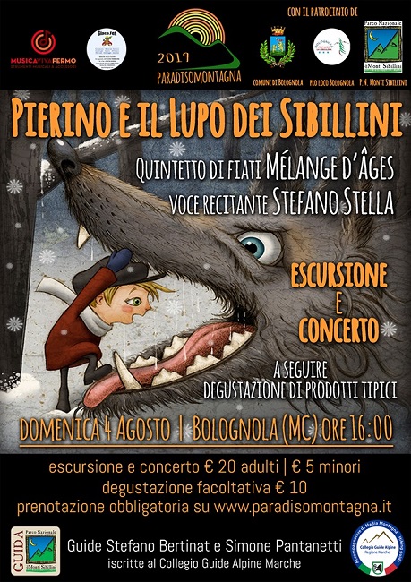 Il secondo, dal titolo “Pierino e il Lupo…dei Sibillini” è legato al mondo della musica e avrà luogo domenica 4 agosto 2019 a Bolognola (MC). Vedrà protagonisti il Quintetto di Fiati “Melange D’Ages” (flauto, oboe, clarinetto, corno e fagotto) e la voce narrante di Stefano Stella. L’escursione abbinata sarà veramente molto particolare in quanto adatta a tutti ma fuori dagli schemi di un percorso tradizionale con curiosi intrecci di luoghi, storie e mitologie dal locale al globale proposte da Stefano Bertinat, segretamente appassionato di storia.