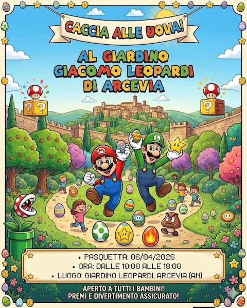 ARCEVIA (AN) – Ad Arcevia la Pasquetta torna a essere un appuntamento imperdibile per famiglie e bambini, con una nuova edizione della grande Caccia alle Uova, quest’anno ispirata al colorato universo di Super Mario Bros. Il Giardino Giacomo Leopardi si trasformerà per l’occasione in un percorso-gioco a cielo aperto, un vero e proprio “livello” interattivo tra natura, fantasia e tradizione.