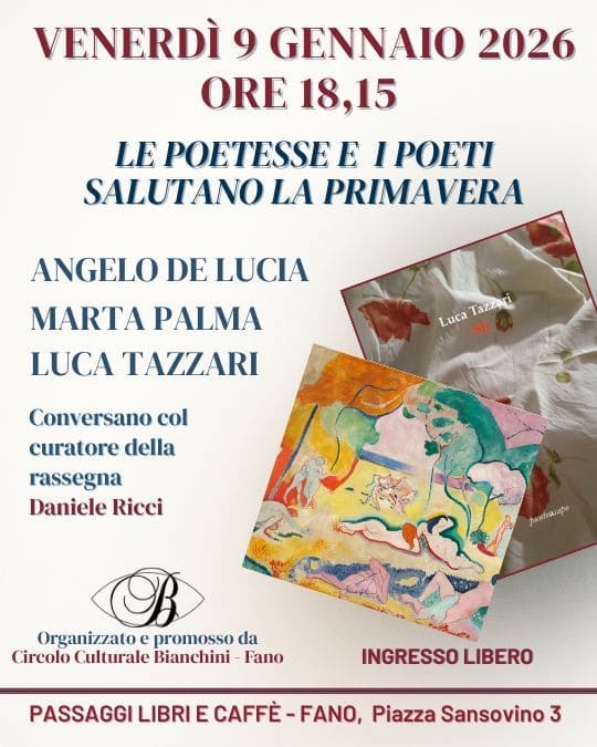 Venerdì 9, ore 18.15 – Le poetesse e i poeti salutano la primavera. Rassegna del Circolo Culturale Bianchini. Angelo De Lucia, Marta Palma, Luca Tazzari conversano col curatore della rassegna Daniele Ricci.