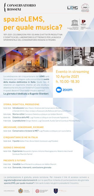 PESARO – Sabato 10 aprile 2021, il Conservatorio Rossini di Pesaro celebra i 50 anni di attività produttiva e didattica del LEMS (Laboratorio Elettronico di Musica Sperimentale) dell’Istituto con una giornata di studi dedicata a Eugenio Giordani, docente di Musica Elettronica e ideatore dello SPACE (Soundscape Projection Ambisonic Control Engine), scomparso prematuramente nel 2020.
