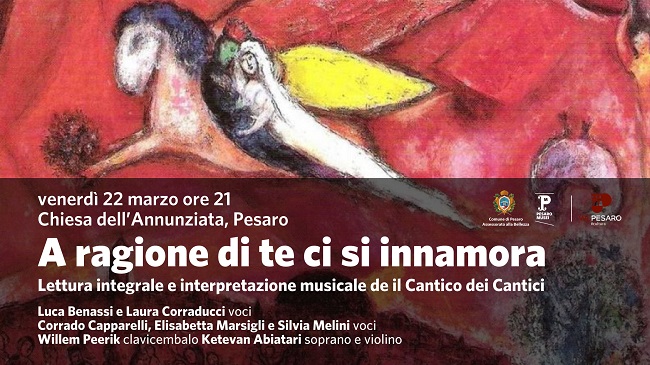 PESARO – Serata di primavera da non perdere, venerdì 22 marzo 2019 alla Chiesa dell’Annunziata di Pesaro. Dalle ore 21 ingresso libero all’incontro “A ragione di te ci si innamora” organizzato dalla poetessa Laura Corraducci, con lettura integrale e interpretazione musicale di uno dei testi d’amore più importanti e celebri tra le sacre scritture, il “Cantico dei Cantici”, canto nuziale entrato nel canone biblico “a furor di popolo” un secolo dopo la nascita di Cristo.