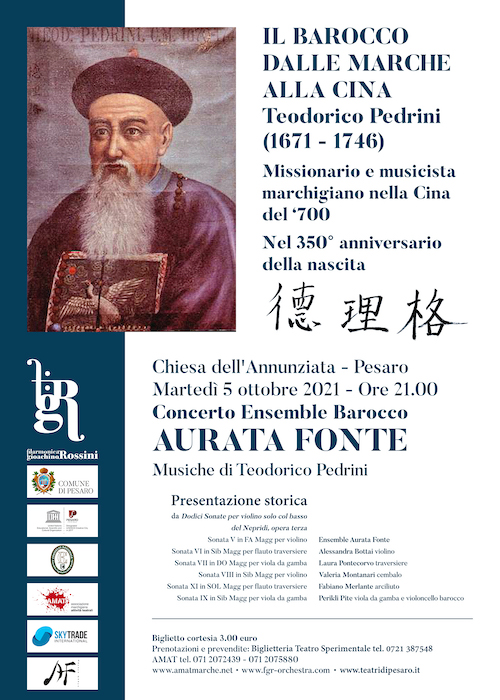 Il concerto è il momento culminante del progetto della Filarmonica Gioachino Rossini su Teodorico Pedrini, missionario e musicista marchigiano in Cina, nel 350° della sua nascita (1671-1746). Il progetto prevede la riscoperta e revisione critica delle Sonate di Pedrini, e la pubblicazione in cd di sei di esse, in prima edizione discografica italiana. Alla prima pubblicazione farà seguito, a breve, l’edizione delle altre sei Sonate contenute nel manoscritto.