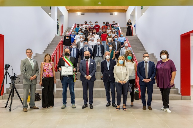 PESARO – Campeggia da oggi la targa “Platinum” ad attestare come la scuola Brancati sia uno degli edifici più ecosostenibili al mondo. Stamattina la cerimonia ufficiale durante la quale è stata svelata la targa alla presenza di Kay Killmann, managing director di Green Building Council (GBCI) Europa, arrivato a Pesaro per «conoscere da vicino la struttura e i professionisti che l’hanno progettata» e congratularsi con l’Amministrazione comunale per aver realizzato l’edificio vincitore del “Leadership Award 2021”, l’oscar per l’architettura green assegnato dall’ente internazionale GBCI.