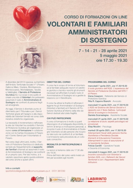 In concomitanza con la pandemia si è infatti registrato un costante aumento del ricorso alla figura dell’Amministratore di Sostegno in ambito familiare; trend che ha spinto i promotori del corso a prevedere l’ammissione allo stesso dei familiari che si accingono a ricoprire tale ruolo o che lo ricoprono già. E per incrementare e rafforzare la rete dei volontari il Servizio di protezione giuridica, gestito dalla Coop. Labirinto, ha deciso di coinvolgere, nella formazione, anche i professionisti di Caritas di Pesaro e del Centro Servizi per il Volontariato di Pesaro.