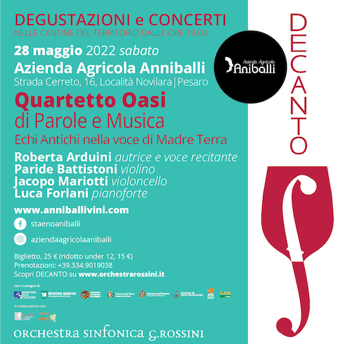 “DECANTO – Degustazioni e Concerti nelle cantine del territorio” è il nuovo festival organizzato dall’OSR che fino al 29 luglio accompagnerà il pubblico in 17 appuntamenti con i Solisti dell’Orchestra Rossini e con ospiti d’eccezione, un vero e proprio tour all’insegna dell’eccellenza marchigiana per andare alla scoperta delle produzioni vitivinicole di qualità e dei territori in cui nascono.
