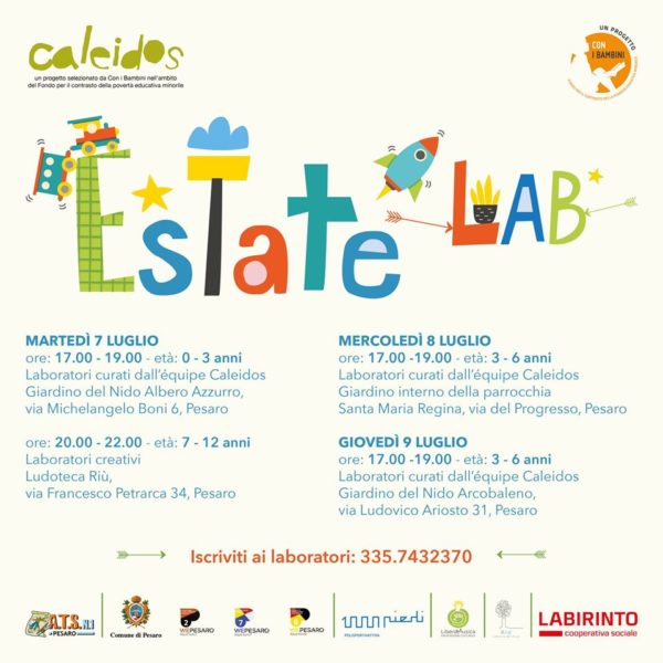 EstateLab rientra nelle iniziative di Caleidos, progetto nazionale che coinvolge la cooperativa sociale Labirinto, il Comune di Pesaro, l’A.T.S 1 di Pesaro, insieme ad altre realtà di 4 regioni italiane; con questa azione il progetto si propone di sostenere insegnanti, operatori e genitori con interventi rivolti alla prima infanzia, facilitando in particolar modo l’accesso delle famiglie ai servizi educativi.