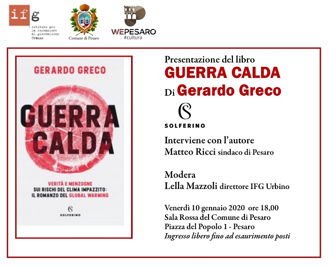 PESARO – Trent’anni di dossier e trame oscure. Verità scientifiche e scenari futuri nel racconto di un’apocalisse che forse si può ancora evitare. Tutto questo è “Guerra calda. Verità e menzogne sui rischi del clima impazzito: il romanzo del global warming”. Il saggio di Gerardo Greco, che verrà presentato venerdì 10 gennaio alle 18 nella sala Rossa del Comune. All’appuntamento con l’autore, moderato dalla direttrice dell’IFG di Urbino Lella Mazzoli, interverrà anche il sindaco di Pesaro Matteo Ricci.