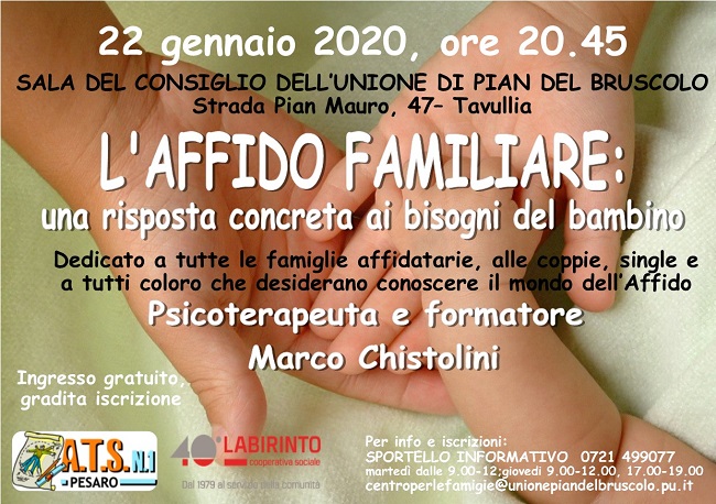 PESARO – Mercoledì 22 gennaio, in Sala del Consiglio dell’Unione Pian del Bruscolo, alle 20.45 si svolgerà un incontro dal titolo “L’affido familiare: una risposta concreta ai bisogni del bambino”, dedicato a tutte le famiglie affidatarie, coppie, single e a tutti coloro che desiderano conoscere il mondo dell’affido.