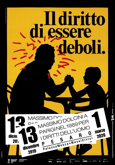 Visitabile fino al primo marzo, l’esposizione nasce da una proposta di Luigi Panzieri, grande collezionista dei poster di Dolcini, ed è curata da Mario Piazza, noto grafico e architetto, e Jonathan Pierini, direttore di ISIA Urbino. Nel 1989 ad ogni grafico venne donata una copia di tutti i manifesti esposti a Parigi; ciò che si può ammirare a Pesaro è la serie appartenuta a Dolcini, oggi nella raccolta Panzieri ospitata nei locali dell’ITET ‘Bramante-Genga’ e prestata per l’occasione. Il titolo “Il diritto di essere deboli” è stato mutuato proprio dal manifesto creato da Dolcini: una celebrazione in chiave quotidiana e ironica, come è tipico del suo stile, della vittoria di Davide su Golia, e dunque dell’intelligenza (e perché no anche di un po’ di furbizia) sulla ‘sola’ forza. Accanto alle opere parigine, Palazzo Mosca accoglie una scelta di manifesti di pubblica utilità che Dolcini realizzò per il Comune di Pesaro in più di vent’anni di attività: una sorta di ‘piccola’ appendice alla mostra, un approfondimento localizzato più che locale, che permette di comprendere come il grafico ha interpretato tematiche sociali di rilevanza mondiale e come poi queste sono circolate in città.