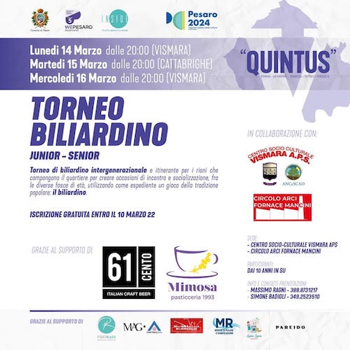 PESARO – Continua senza sosta la programmazione di “Quintus – Il Quartiere microcosmo del futuro”, il progetto del Q5 “Vismara-Cattabrighe”, Capoluogo della Cultura per il primo semestre del 2022, iniziativa collegata alla candidatura di Pesaro a Capitale italiana della Cultura 2024.