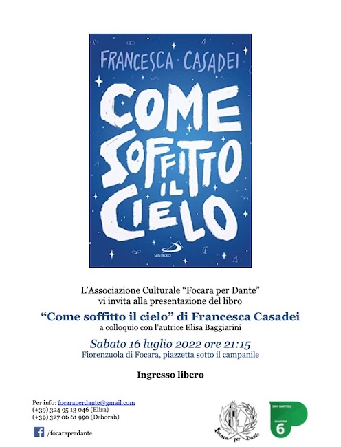 FIORENZUOLA DI FOCARA (PU) – Si terrà domani, sabato 16 luglio 2022 alle ore 21.15 a Fiorenzuola di Focara nella piazzetta sotto il campanile la presentazione di “Come soffitto il cielo”, romanzo d’esordio di Francesca Casadei, docente di lettere urbinate.
