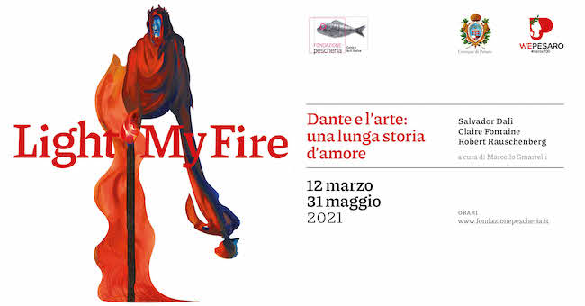 PESARO – Rimandata per il passaggio in zona rossa della città (avrebbe dovuto inaugurare il 12 marzo) e visibile finora solo dall’esterno, giovedì 29 aprile apre al pubblico ‘Light My Fire. Dante e l’arte: una lunga storia d’amore’, la mostra a cura di Marcello Smarrelli che rappresenta una delle iniziative cardine con cui Pesaro celebra i 700 anni dalla morte del Divino Poeta. La Pescheria diventa ‘luogo dantesco’ della città e accoglie due famose serie di incisioni realizzate da Salvador Dalì e Robert Rauschenberg per illustrare la Divina Commedia e una video installazione dell’artista Claire Fontaine. L’evento della Fondazione Pescheria-Centro Arti Visive è promosso in collaborazione con il Comune di Pesaro.