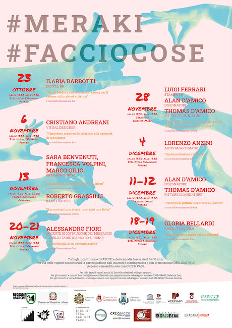 Progettata all’interno di Meraki, #facciocose è una rassegna di workshop creativi dove imparare, ispirarsi e mettersi alla prova. Coordinati da Zoe, gli appuntamenti alla Biblioteca San Giovanni sono opportunità speciali di incontro con persone eccezionali che hanno trasformato la propria passione in lavoro.