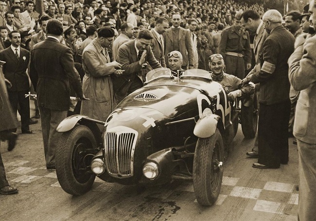 La carriera motociclistica culminerà tre anni più tardi con la conquista del campionato europeo (equivalente dell’attuaIe mondiale) con la poderosa Gilera 500 cc 4 cilindri. Nel secondo dopoguerra il pilota pesarese si cimenta con le quattro ruote con Cisitalia, Frazer Nash, Maserati, Osca MT 4. Nel biennio 1950/’51 sarà pilota ufficiale della Scuderia Ferrari affiancando Alberto Ascari e Gigi Villoresi al debutto nel primo campionato di F.1. Tante vittorie e prestigiosi piazzamenti ai Grand Prix in Europa e in Sud America compreso il G.P. dedicato ad Evita Peron net 1950. Un terribile incidente occorsogli alla Mille Miglia dell’anno successivo, dove era dato tra i favoriti, dopo il secondo posto alle spalle del conte Giannino Marzotto ottenuto nell’edizione del ’50, ha posto fine alla sua carriera. Serafini ricoprirà per sempre un posto di tutto rispetto tra i “campioni dell’ardimento e della legge” come lo aveva definito in una lettera inviatagli dal giornalista Gianni Brera dopo I’incidente e pubblicata nel volume che ripercorre Ie tappe della carriera di Dorino Serafini. II giornalista e scrittore pesarese Franco Andreatini, autore della biografia, era legato da affetto filiale a Serafini, lo ha accompagnato per dieci anni ad ogni rievocazione in Italia e all’estero. Le frequentazioni gli hanno permesso di fissare su carta aneddoti e testimonianze dei tanti colleghi piloti di quel periodo: da Juan Manuel Fangio ai fratelli Marzotto. A questo proposito rimane indimenticabile la prefazione e la presentazione del libro da parte del conte Giannino Marzotto, amico personale di Dorino e suo compagno di squadra alla Mille Miglia. II volume, pubblicato nel 1997, è ormai introvabile e si sta pensando ad una ristampa. L’Autoclub Storico Pesaro “Dorino Serafini” si è sempre adoperato per onorarne la memoria e, tra le varie iniziative, si è fatto promotore dell’intitolazione di una via cittadina nel 2009 in occasione del centenario della nascita.