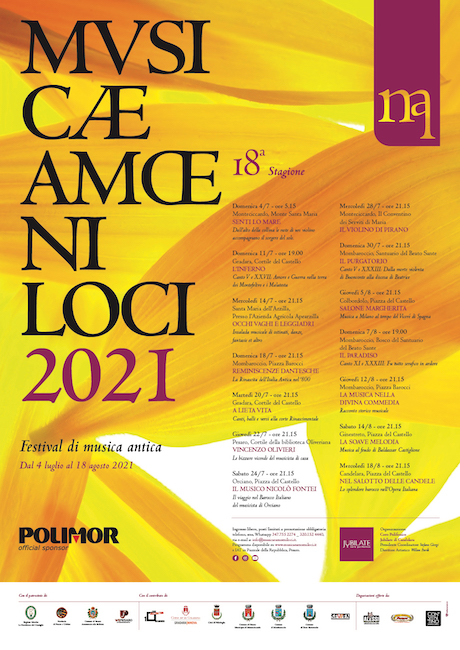 Alta qualità e multidisciplinarietà sono gli elementi fondanti del Festival cui quest’anno – segnato dal 7° centenario della morte del Divin Poeta – si aggiunge la guida simbolica di Dante. In programma nei 14 appuntamenti, letture, musiche, canti, lezioni, ‘scoperte’ e ‘svelamenti’. Ospiti preziosi di questa edizione: la professoressa Maria Chiara Mazzi, il violinista Tommaso Luison, l’Ensemble di flauto dolce “Les voix de bois”, l’Ensemble vocale “La Flora”, l’Ensemble “Dolci Accenti” con Daniele Cernuto e Calogero Sportato, l’Ensemble “Concordia”, il Coro San Giuseppe di Gradara, Giorgio Pinai, l’Ensemble “Cenacolo Musicale”, l’Insieme di Musica Antica “Fairy Consort” di Chieti; per il canto: Alida Oliva soprano, i contralti Bianca Simone e Francesca Biliotti e Aloisa Aisemberg mezzo-soprano. Per le letture Alessandro Guidotti e ancora i due frati francescani Fra Renato Martino e Fra Lorenzo Del Bene che sorprenderanno il pubblico con endecasillabi sciolti, terzine ed esecuzioni gregoriane. Il Coro Polifonico Jubilate di Candelara è presieduto e coordinato da Stefano Giorgi e diretto dal M° Willem Peerik.