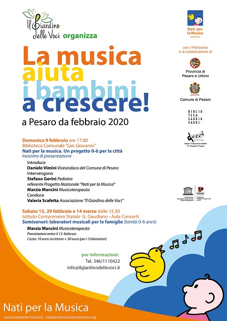 PESARO – Domenica 9 febbraio alle 16.30 alla Biblioteca San Giovanni, si presenta ‘Nati per la musica’; il progetto nazionale approda a Pesaro Città Creativa Unesco della Musica grazie all’associazione ‘Il Giardino delle Voci’ in collaborazione con il Comune di Pesaro/Assessorati alla Bellezza, Crescita e Solidarietà e la Provincia di Pesaro e Urbino. All’incontro interverranno il pediatra Stefano Gorini, referente di ‘Nati per la Musica’, e Marzia Mancini, musicoterapeuta e docente esperta nell’educazione musicale in età precoce; conduce Valeria Scafetta/Il Giardino delle Voci.